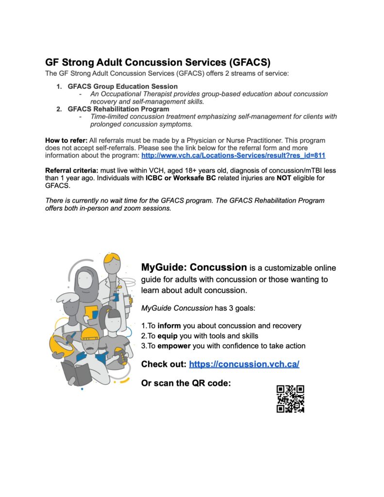 Referral criteria: must live within VCH, aged 18+ years old, diagnosis of concussion/mTBI less than 1 year ago. Individuals with ICBC or Worksafe BC related injuries are NOT eligible for GFACS.