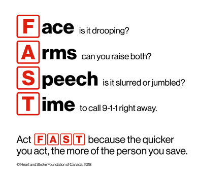 One day, you might be called upon to do the same. Not sure what the signs of a stroke are? There’s no time like the present to learn! From the Heart & Stroke Foundation of Canada, here’s the FAST method for identifying a stroke: